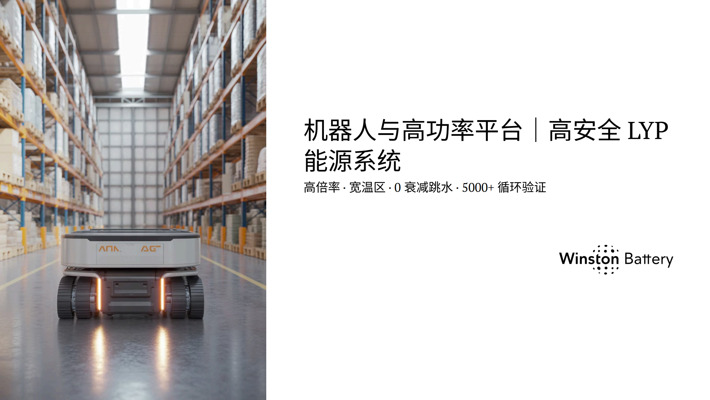 Winston Battery 的 LYP 电池体系,正是为这种高应力、高安全要求的应用场景而设计。LYP 50Ah 电芯具备极低内阻,在高倍率调用下电压几乎不跳水,可同时支持瞬时爆发力与持续输出能力。大容量单体设计减少并联数量,从系统层面提升安全性与可靠性。水性 LYP 电化学体系避免热失控路径,即使在碰撞或极端情况下也不自燃、不爆炸,并可直接用水灭火。同时,超宽温区设计使其在严寒与高温环境中依然保持稳定性能,适应机器人全天候运行需求。